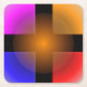 multicolored coloured squares on black background, and centre highlight. Abstract design