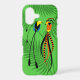 Colourful vector art of a pair of fictional exotic birds of paradise with long tail feathers and bright plumage on a green jungle like background.