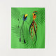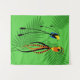 Colourful vector art of a pair of fictional exotic birds of paradise with long tail feathers and bright plumage on a green jungle like background.