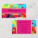 A colourful abstract business card featuring a chequered pattern with festive confetti and eye catching text backgrounds.