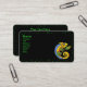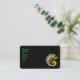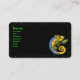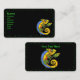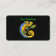 This business card is black with a vibrant green polka dot border and a bright colourful lizard in colours of blue, orange, yellow with green arms and legs holding a branch with a leaf. Customise your information on the front and back with the templates.