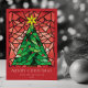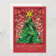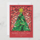 These bright and colourful 5" x 7" flat Christmas greeting cards feature a handmade watercolor stained glass window design of a green Christmas tree with a gold star and red ornaments framed in shades of red on a red background The editable greeting is "Merry Christmas," with placeholders for your name and year. The back has the editable message, "Wishing you peace, love and joy this holiday season."