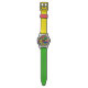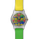 A fun bright colourful wrist watch with a funky geometric patterned multicolored face, looks stunning with it's two tone watch strap in a combination of green and yellow. With nice clear white numbers making it easy to tell the time.