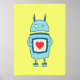 Cute poster with a cartoon illustration of a blue clumsy cartoon robot holding a plate with a heart on bright greenish-yellow background. This robot poster is suitable for kids who love robots. It will make a great gift for geeks, too.