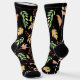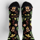 A pattern of vibrant autumn leaves on a black background. Space for your name or text in red and green on the foot. Personalize the text to make these socks your socks.