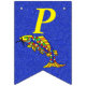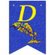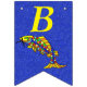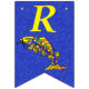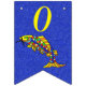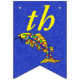 This flag shaped bunting Happy Birthday banner has a bright colourful festive abstract fish in yellow, blue, and orange on a vibrant deep blue background with tiny sparkle look flecks. Customise the birthday year and the text with the templates.