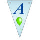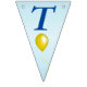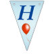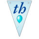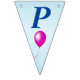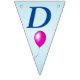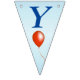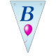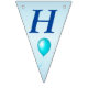 This flag shaped bunting Happy Birthday banner is light blue with dark blue letters with bright festive balloons in multiple colours of red, yellow, blue, pink and green.  Customise the birthday year with the templates.