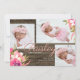Floral Brights, watercolor flowers in tropical pinks, corals over rustic barn wood, boho chic three photo baby birth announcement. Cheerful watercolor brightly coloured foliage adorns the lovely photos of your little one. Dark wood contrasting frame background and elegant hand script first name in centre gently introduces her.