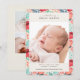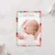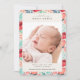 Beautiful bright bloom floral pattern vertical photo birth announcement with a large single photo on the front and space on the back for two more horizontal pictures. Pretty patterned frame on the front in shades of pink, mint, blue, coral, and green with elegant calligraphy style script and sans serif typography fonts.