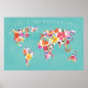 This watercolor print features a bright floral world map| By Wild Apple Portfolio