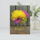 A wedding RSVP featuring a photo on front of jar of bright pink and green daisies topped with a yellow dahlia. Background is barnwood. Personalise the text on front and back.