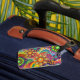 This is an image of bright colourful flowers on a luggage tag.