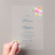 Bright Garden Floral Party Watercolor Wedding Acrylic Invitation, featuring a stunning flower pattern back in soft hues of pale yellow, lavender, pink, and blue. This design exudes a fresh, tender, and delicate charm, perfect for a spring or summer wedding. The elegant watercolor florals create a romantic and airy feel, making it an ideal choice for couples looking for a light, floral-themed wedding invitation that beautifully complements a garden or outdoor celebration.