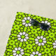 Bright green and white floral-patterned towels with daisies are displayed; one hanging on a rod, the other folded, evoking a fresh, cheerful vibe.