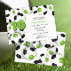 This soccer themed party invitation features clusters of bright green, black and white soccer balls at the left and top edges on the front and a single cluster covering the back of the invitation - customise the party details on a white background - by katz_d_zynes