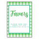 Add a touch of elegance to your gift table with our Bright Green Gingham Favours Sign. Featuring a stylish bright green gingham pattern and the words "Favours" along with " Please take one! Thank You for Celebrating with Us," this tabletop sign is a charming way to guide your guests.