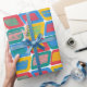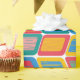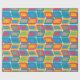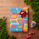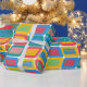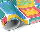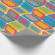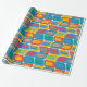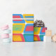 This wrapping paper has a mid-century modern design of bright colours that make rounded rectangles with other rectangles inside formed by a collection of lines.