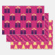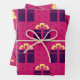 Bright magenta pink wrapping paper set, adorned with festive yellow pine trees, modern purple gift silhouettes, and a cheery, minimalist purple and yellow pattern.