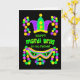 A vibrantly coloured Mardi Gras Greeting Card for a Father, with a crown, a mask and a string of beads in bright green, purple and yellow on a black background. You can change the inside message if you wish.