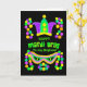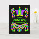 A vibrantly coloured Mardi Gras Greeting Card for a Nephew, with a crown, a mask and a string of beads in bright green, purple and yellow on a black background. You can change the inside message if you wish.