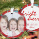 Bright Merry Script Red Knit Knitting Family Photo Ornament. add your photo on the front and your name and year on the backside.