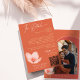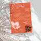 A modern wedding detail card in trendy bright orange and grapefruit red. This shade of orange is called Verona Sunset. Details in faux gold, a silhuette of a delicate flower. Modern typography and on the back add your own photo in arched shape. Make sure to add your QR code website.