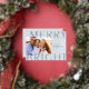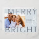 A modern holiday card featuring a horizontal or landscape-orientated photo with "Merry & Bright" overlaid in oversized silver foil lettering. Personalise with your custom holiday greeting, family name, and the year. A chic and modern minimalist choice for your Christmas 2022cards.