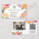 Bright pink colourful Floral illustration boho makeup and hair business card featuring pretty hand painted floral blooms in pink, yellow, orange flowers and greenery. with a gold geometric terrarium frame and elegant script brush typography. Add your social media, logo, qr code and a photo.