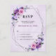 Modern floral midsummer wedding RSVP postcard features a bouquet of watercolor roses peonies in shades of bright purple plum, rose, pink , sage with lush green botanical leaves and eucalyptus with shiny black geometric frame.