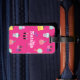 A luggage tag with a pattern formed using makeup, beauty and grooming products like perfumes, facial and skincare lotions, lipsticks, nail polishes, hair dryer, comb and mirror. Colourful, trendy and chic with hues of pink and purple for the girly touch! Bright pink background! Personalise with girl's name.