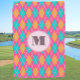 This custom ladies personalised golf towel features vivid orange, aqua, and pink argyle with a customisable monogram on a pink background. It's a stylish, cute gift for a golfer. It's a useful present for your mum, sister, grandma, or any lady whose hobby is playing golf. Women monogram golf towels.