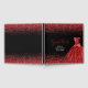 A beautiful bright red themed elegant watercolor dress gown on a black background with faux glitter at the top and bottom of the guest book.