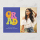 This fun graduation postcard has a modern take on vintage 1970s design. The front of the card includes 70s lettering on the left and a vertical photo on the right. The retro typography reads "Grad" in shades of bright orange, bold pink, summer green, and sunny yellow against a grape purple background. The graduate's name and school are written below the typography, and the graduation year is written across the D in "Grad". On the back, you can add a message to recipients and/or graduation party information.