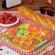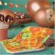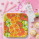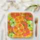 A colourful print featuring circles of overlapping sliced citrus fruit in bright orange, yellow, green, and pink hues covers this pretty party plate.