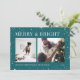 A modern and festive design for your holiday greetings featuring two photos aligned side by side, on a vibrant teal background dotted with stars. "Merry and Bright" appears across the top in classic serif lettering, with "Season's Greetings" your family name, and the year along the bottom. A cheerful and colourful design for Christmas 2021.