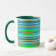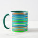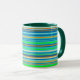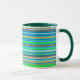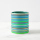 This cheerful mug is decorated with a lively pattern of green, gold, orange, blue, turquoise and white horizontal stripes and is trimmed with green.