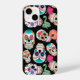 Bright and colourful images of sugar skulls make a fun pattern on this unique phone case. There are several different skull images, all individual in various colours, and placed on a dramatic black background.