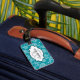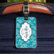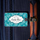 This beautiful luggage tag features a white paisley design on bright teal on front and back with areas you can customise with your name and last name initial as well as phone number or full address.