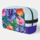 A bold, maximalist tropical floral print with big purple, orange, and pink blooms on a dark blue background,