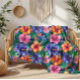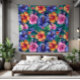 A bold, maximalist tropical floral print with big purple, orange, and pink blooms on a dark blue background,