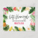 Bright tropical foliage lets flamingle birthday party invite. A modern bright watercolor design. Fun tropical florals, summer fruit and flamingos. Part of a bright, tropical collection.