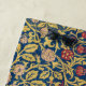 This design features a fabric pattern created by British artist William Morris (1834–1896), who was a founder of the Arts and Crafts movement. It shows green foliage on a blue background with red and pink touches of colour. There are visible sunflower, violet and columbine flowers. The original pattern was first designed in 1883.