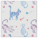 Watercolor painted print with bright, cheery, whimsical cats. White fabric and colourful patterns of pink, blue, red, teal blue, purple, turquoise blue.