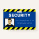 This custom photo identification badge features a sample photograph on the left with the company name or other text, and employee name to the right. The title "SECURITY" is printed above it in bold black font over a bright yellow background. You can include your company name or additional text below the image, as well as an employee name.