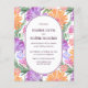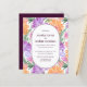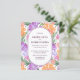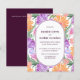 This design features an elegant botanical vivid pattern of flowers and leaves in spring style in bright watercolor palette of yellow, orange, purple and pink. Your wedding details displayed in a modern combination of fonts over a white oval frame with a chic Purple border. Perfect for summer or spring celebration, or outdoor or garden wedding with a cheerful touch.