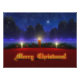 A 3D Christmas scene created in Vue, with candles set on red in front of pine garland accented with red and gold ornaments. In the snowy background are blue-green fir trees against a swirling fractal sky sprinkled with stars. A single sparkling star dominates the night sky. In front of the holiday decorations is a glowing gold Merry Christmas greeting.