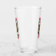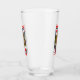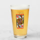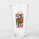 This glass tumbler for beverages has a brightly coloured fancy red heart queen playing card in a black border with a row of vibrant red hearts above and below her on the front and back.