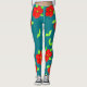 Designer leggings, turquoise with red flower art print. The background can be personalised to any colour.