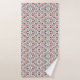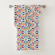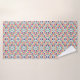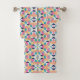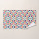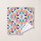 Brightly patterned towels and a washcloth with colorful floral and leaf designs in blue, pink, and orange tones, conveying a vibrant, cheerful atmosphere.