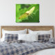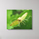 This awesome canvas print features a detailed macro photograph of a small yellow coloured moth with brown markings perched on a hollyhock leaf. In the photograph you can see the underside of the moths wings, the fur on the top of its back, its bulging eyes and its brown and white legs. You can also see that it has unfurled its feeding tube to test whether or not the hollyhock leaf is food.